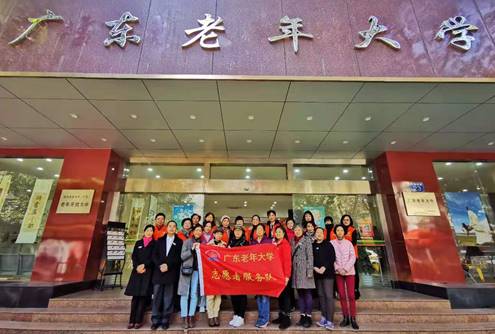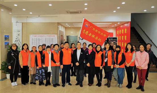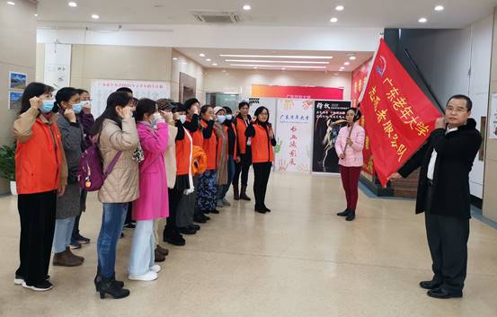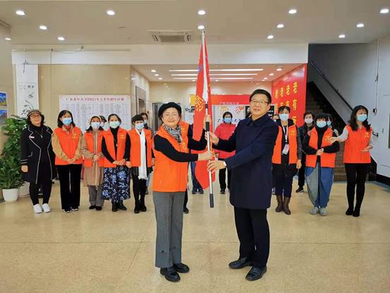 12月30日下午,天气虽然很冷,但是广东老年大学二十多位志愿者服务队成员都早早地回到学校,穿上队服,戴上队徽。广东开放大学孙平副校长有政协常委会议在身,却在百忙中抽出宝贵的时间,为志愿者服务队授旗。当志愿者服务队队长白梅同学从孙平副校长手中接过大旗,就寓意着广东老年大学志愿者服务队的新征程开始啦!